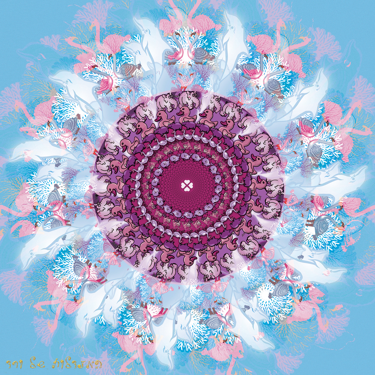 - מנדלת בעלי חיים, פלמינגו, דולפינים, פילים, ברווזים וליוויתנים על רקע תכלת בצבעוניות עדינה