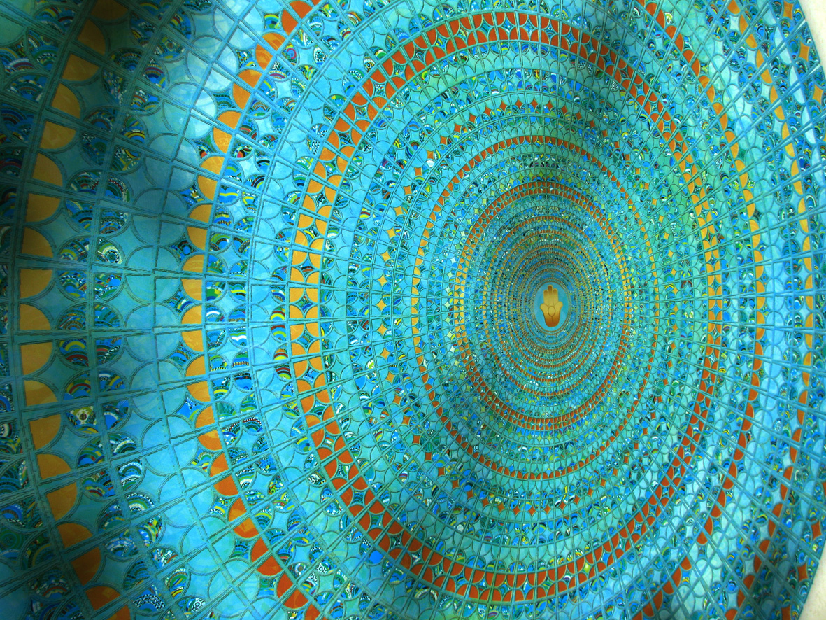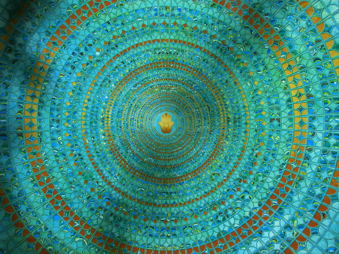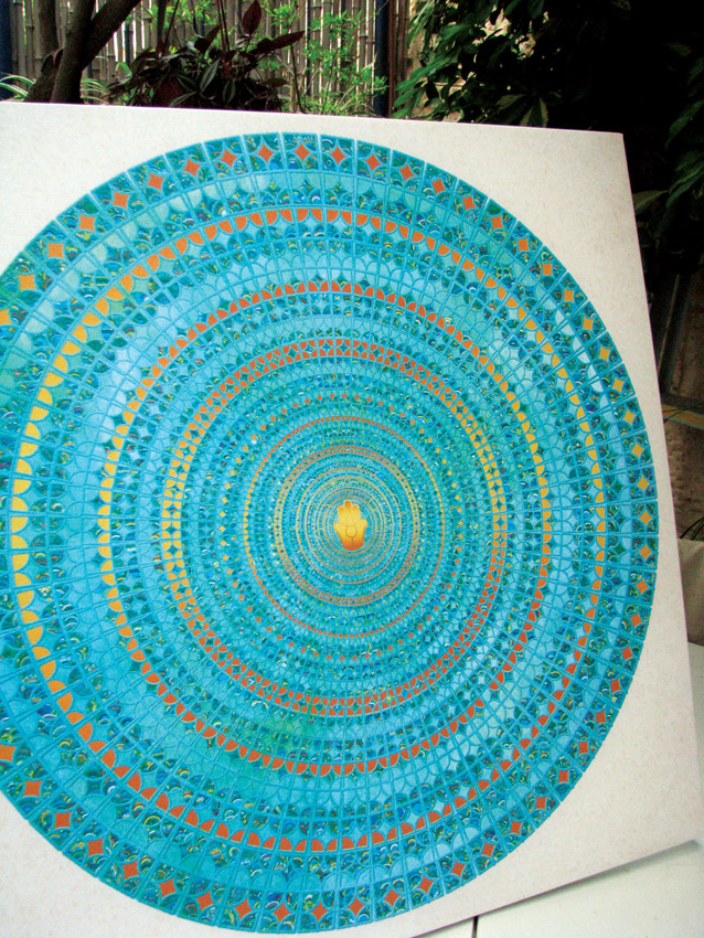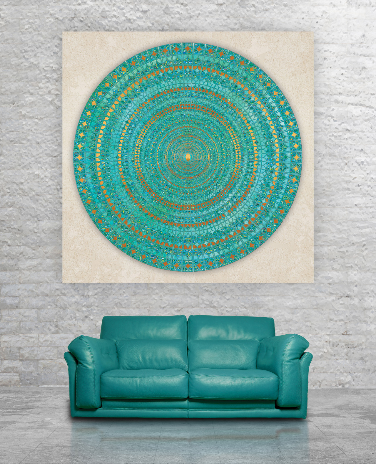 מנדלה מהממת הבנויה מעיטורים בגווני טורקיז ונגיעות זהב על רקע בהיר, במרכזה חמסה. ניתן להזמינה על גבי זכוכית או קנבס.